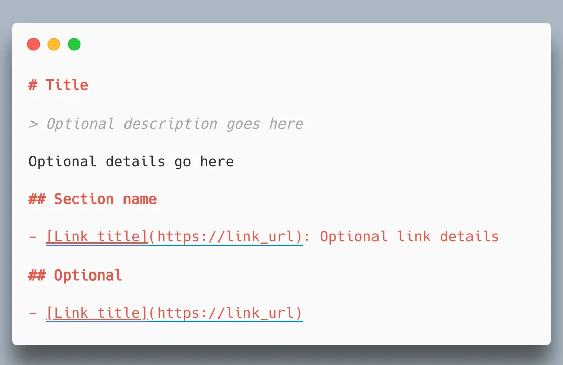- Zero or more markdown sections delimited by H2 headers, containing “file lists” of URLs where further detail is available