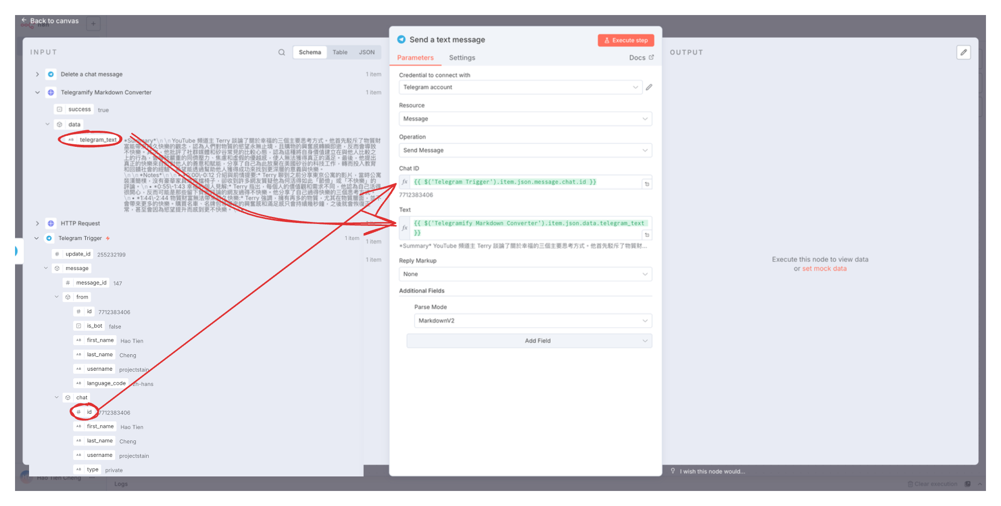到這裡其實已經算大功告成了,接下來我們只要將總結摘要回傳到 Telegram,就成功完成這個 workflow。