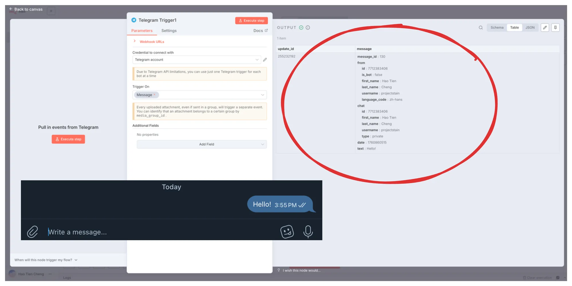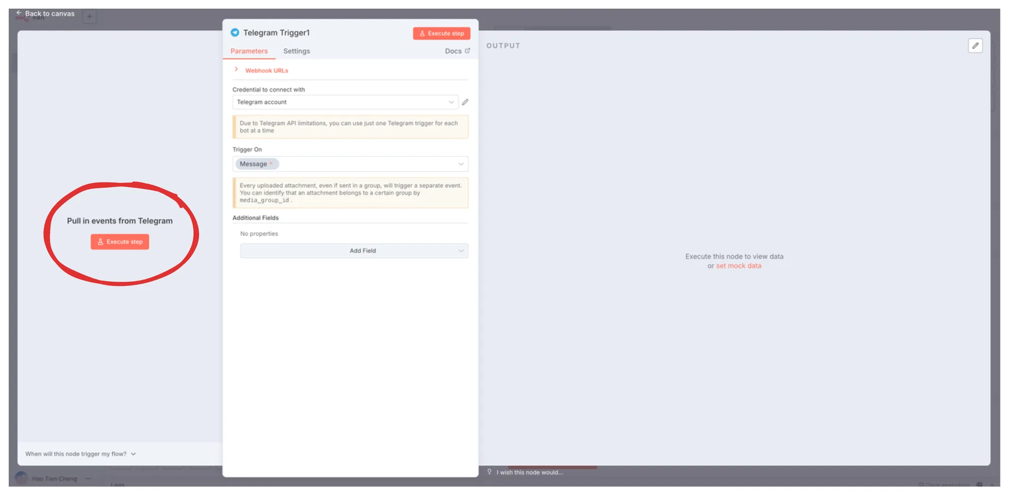 新增 Telegram Trigger 後,我們可以試試 Pull Event,也就是試著傳訊息給 bot。