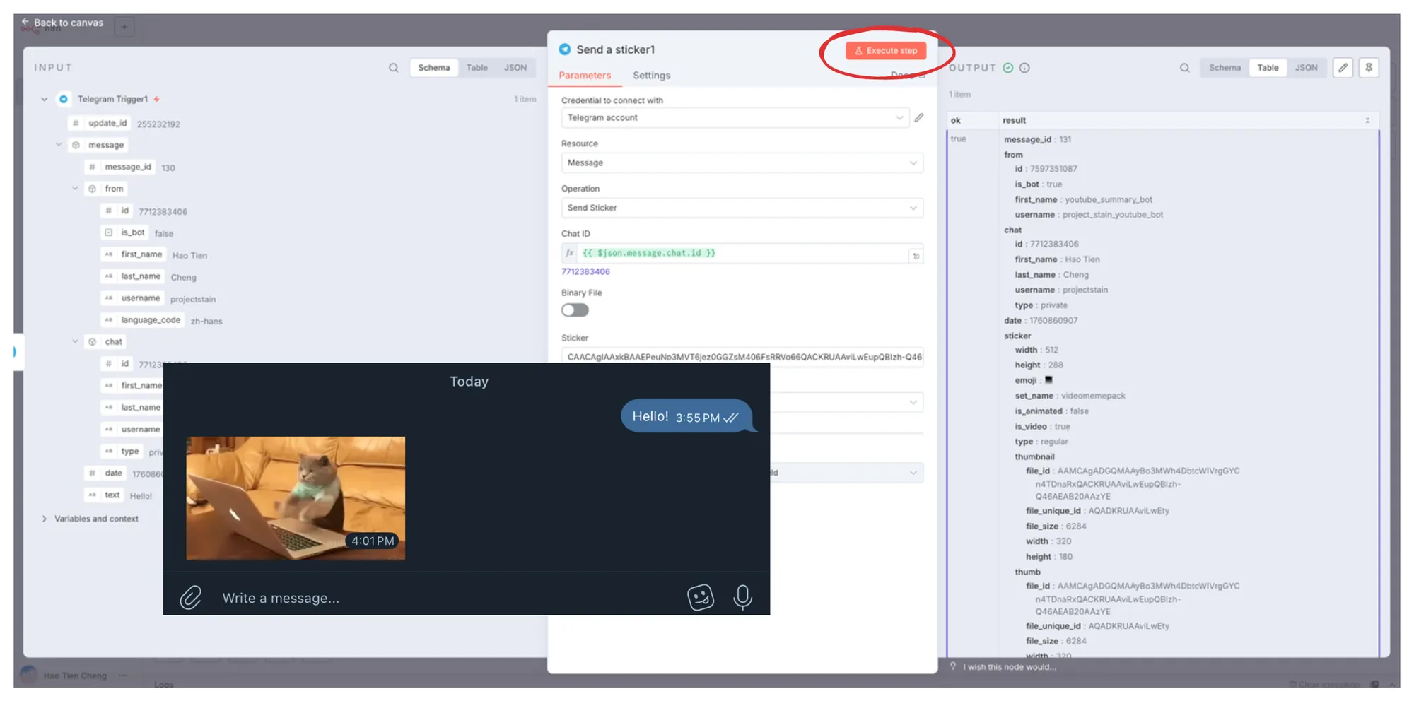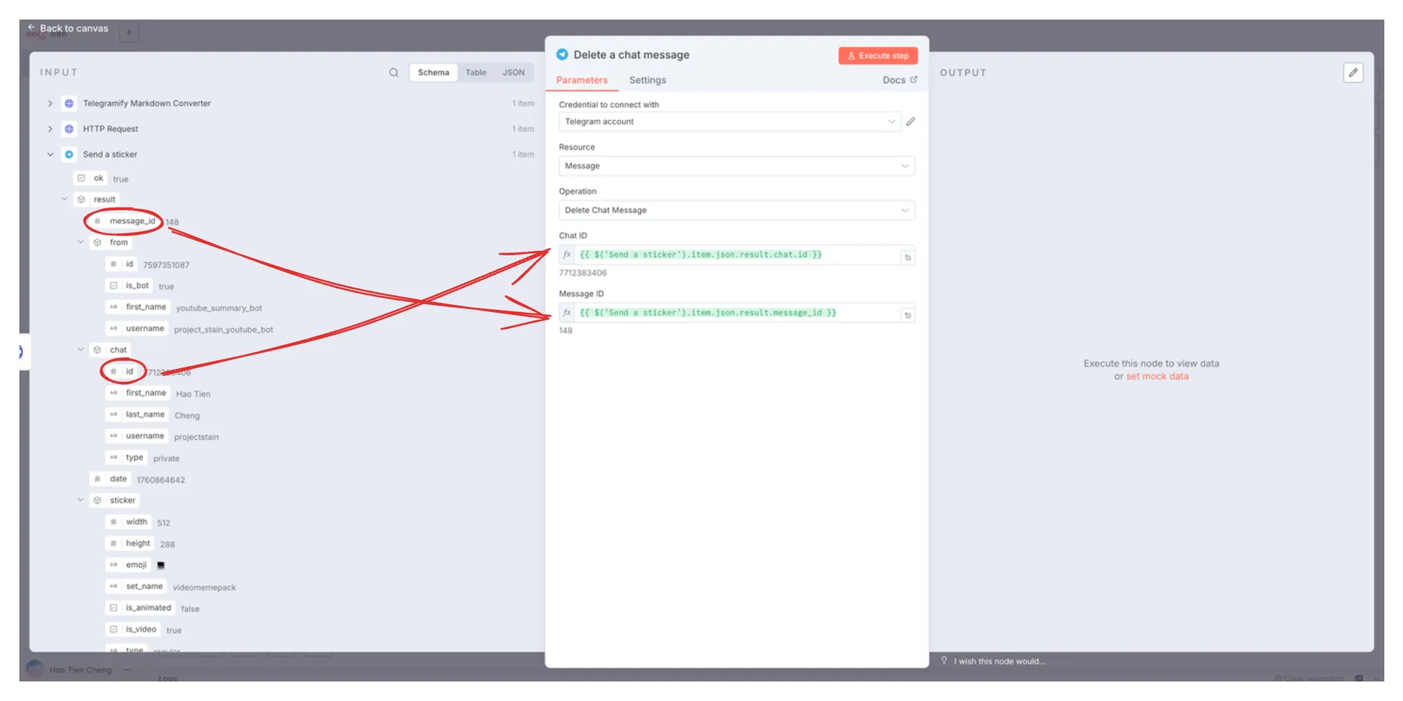接下來我們再建立一個 Telegram Send a Sticker 節點,並且將對應的 Chat ID 拖拉到指定欄位。