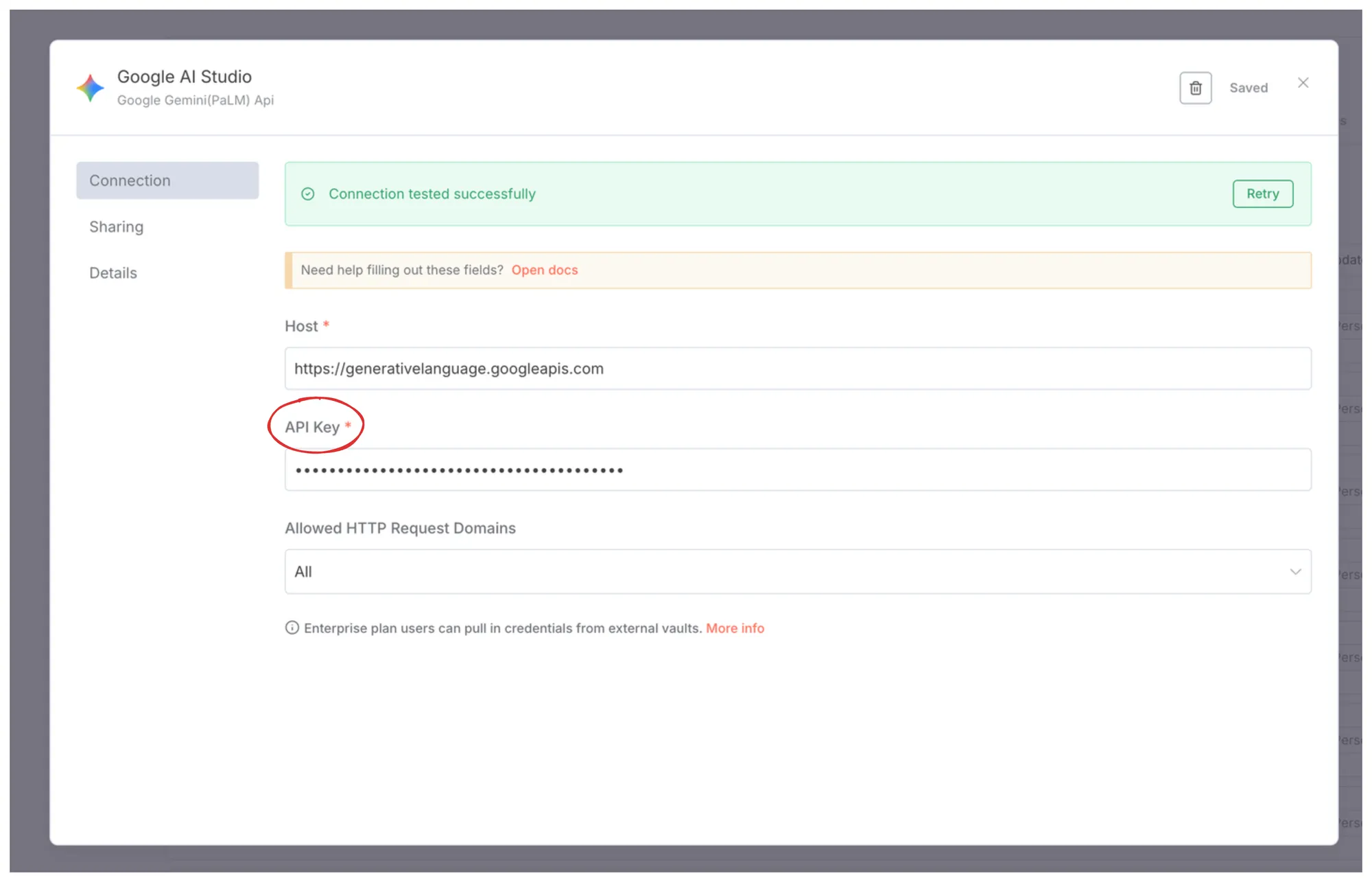 儲存過後,如果上方出現 Connection tested successfully ,那恭喜你,你已經可以在 n8n 使用 Gemini 的服務!