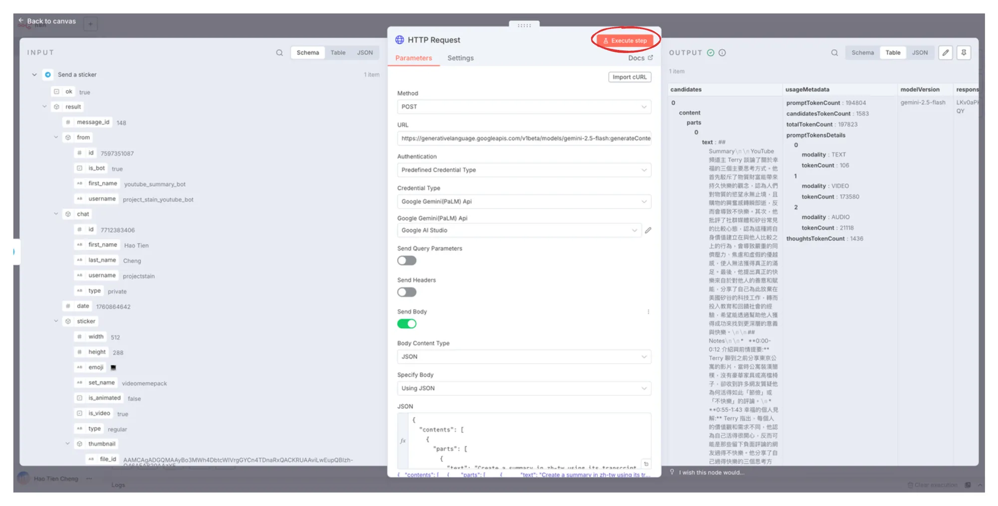 接下來的步驟會比較複雜,由於目前 n8n 官方的 Gemini 節點還沒辦法直接取得 youtube 轉錄稿的功能,我們將直接使用 API Request 的方式跟 Gemini 互動。