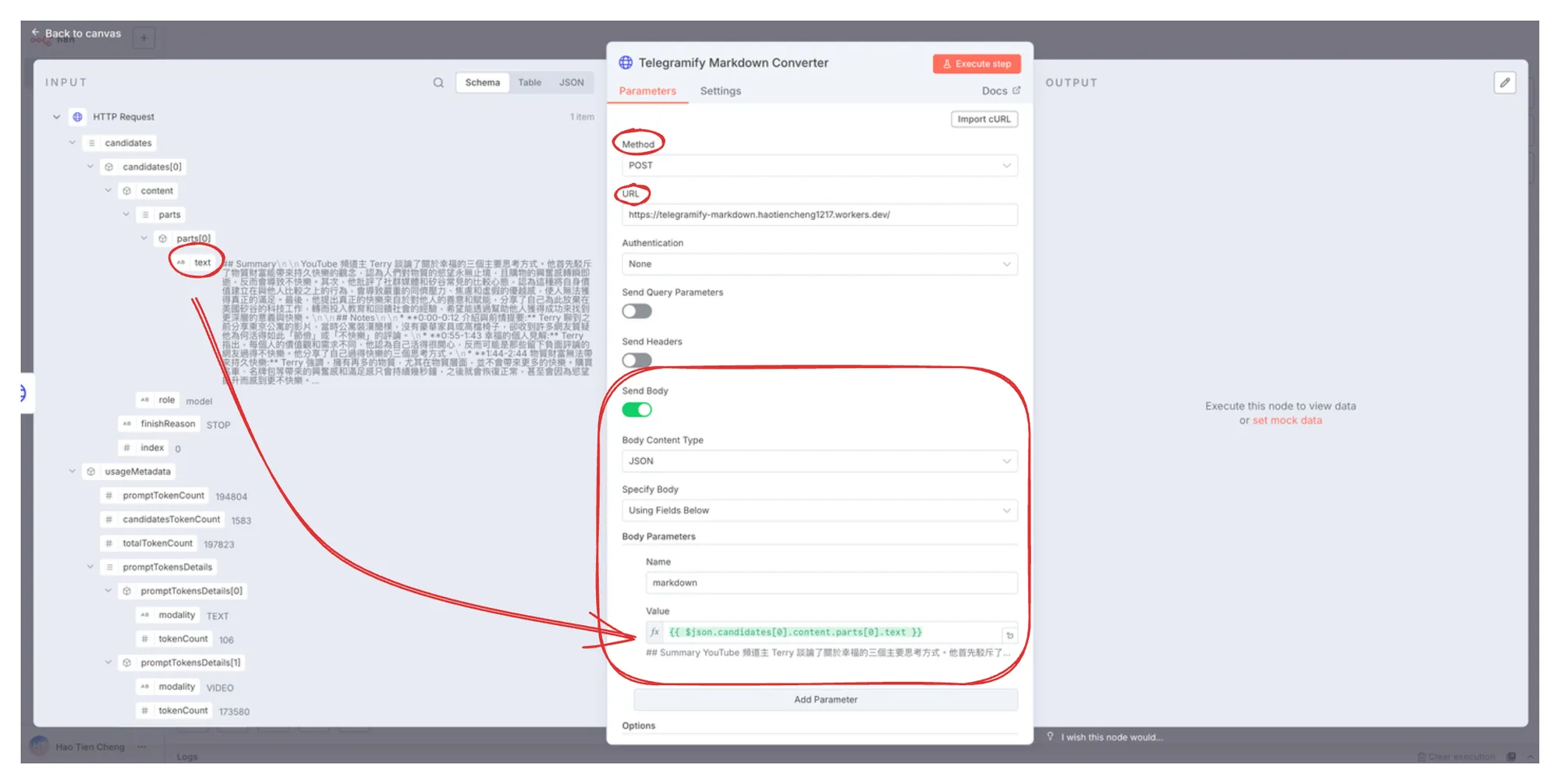 Send BodyBody Content Type選擇JSONSpecify Body選擇Using Fields BelowName填入markdownValue將左側的 text 拉到對應的欄位中
