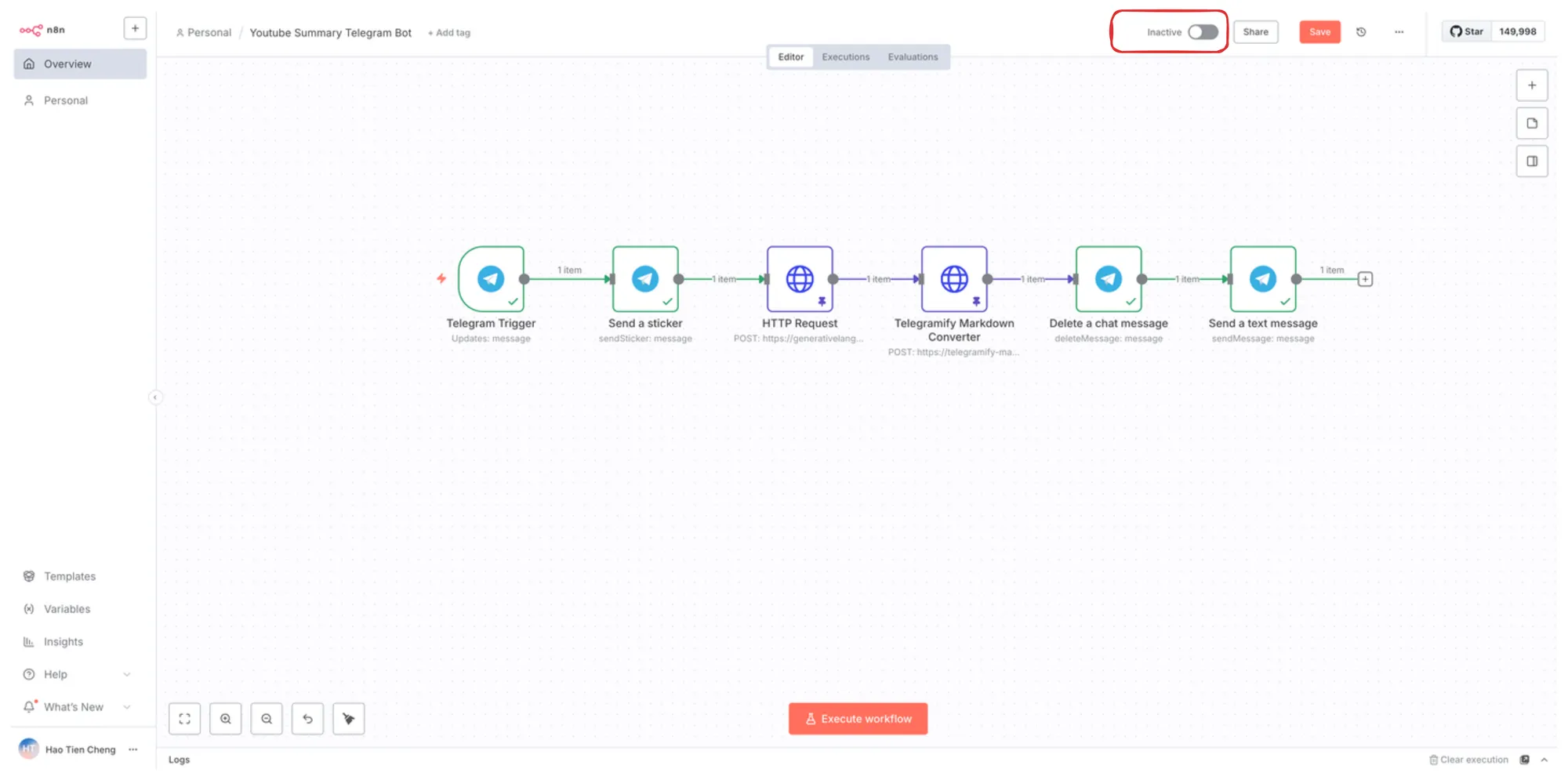 啟用工作流後,你的 Youtube 摘要機器人就正式完成!