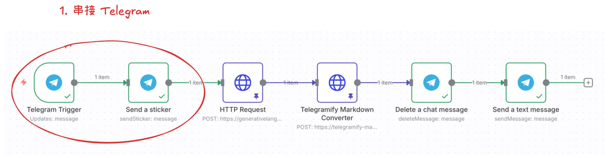 新增 Telegram 節點:接收訊息、回傳貼圖