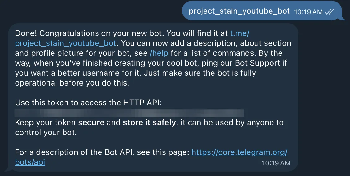這邊我們可以直接傳送一個 youtube 連結給 telegram,方便後續直接測試使用。