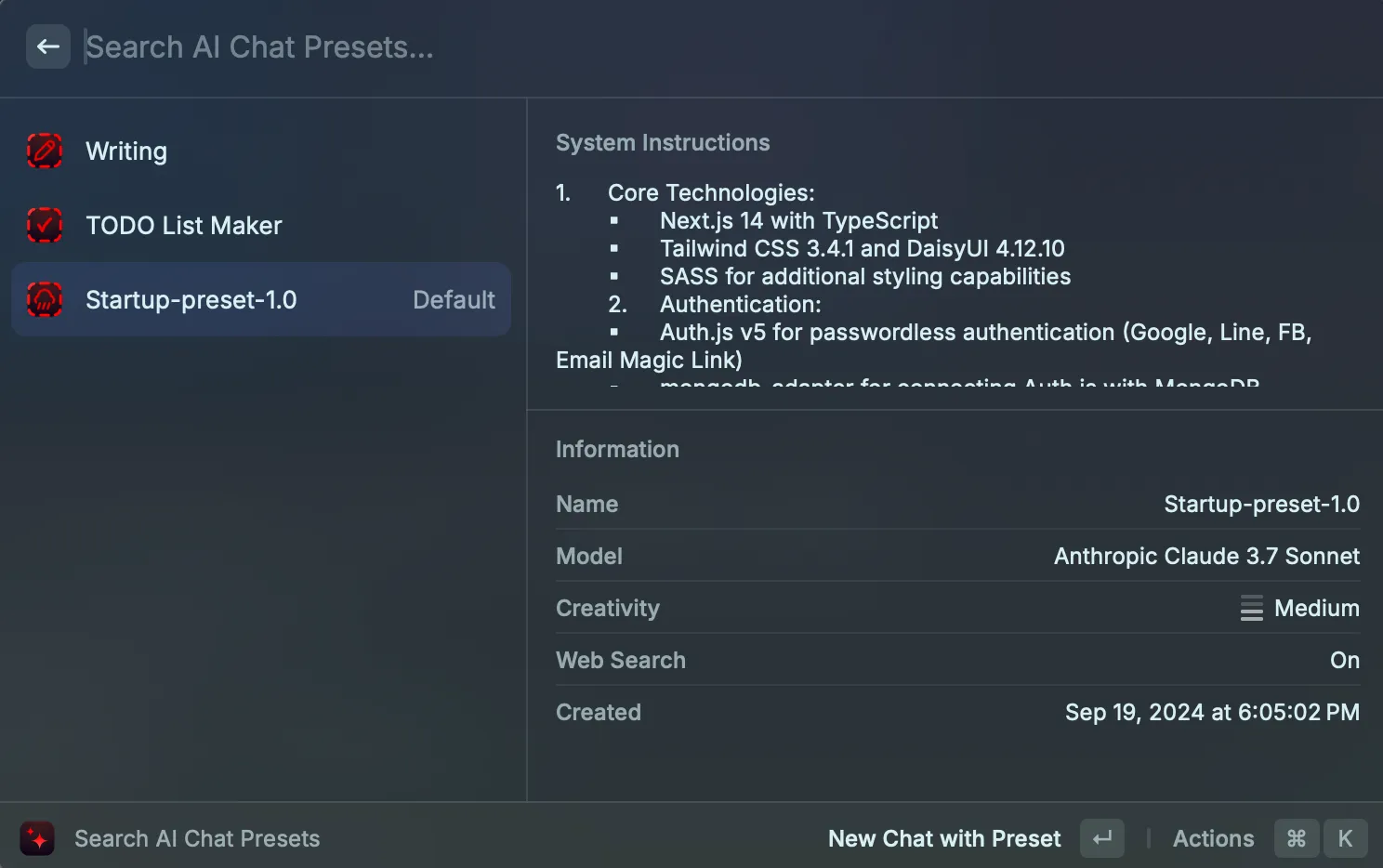 - 使用預設提示:我在 Raycast 設定了專用的 code 相關 preset(有興趣的可以寄信給我拿完整 system prompt)