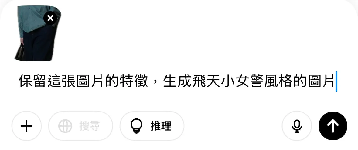 2. 輸入 Prompt:保留這張圖片的特徵,生成飛天小女警風格的圖片